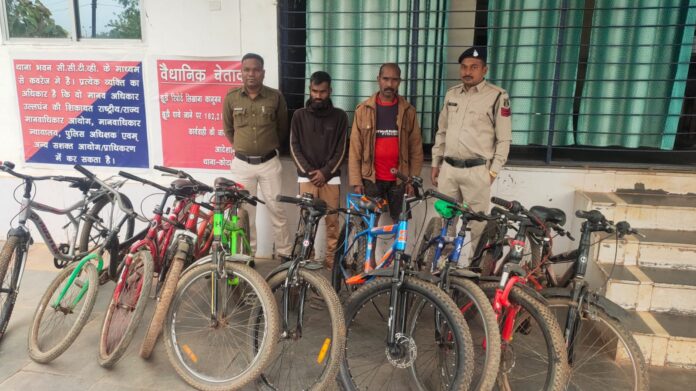 विवरण- प्रार्थी नरेंद्र कुमार भारती साकिन डाकबंगला कोटा थाना कोटा दिनांक 19.01.2024 को थाना उपस्थित आकर रिपोर्ट दर्ज कराया की मेरे नाती का रेंजर साइकिल को दिनांक 13.01.2024 के रात्रि में कोई अज्ञात चोर चोरी कर ले गया है। प्रार्थी के रिपोर्ट पर अपराध पंजीबद्ध कर विवेचना कार्यवाही में लिया गया। पूर्व में भी रेंजर साइकिल चोरी होने की मोबाइल के माध्यम से मौखिक शिकायत थाना प्रभारी कोटा को मिल रहा था जिसके परिप्रेक्ष्य में थाना प्रभारी कोटा द्वारा पुलिस टीम बनाकर थाना कोटा क्षेत्रों में सतत् निगाह रखी जा रही थी, मुखबिर से सूचना मिला की ग्राम भरारी में संजय दास मानिकपुरी तथा ग्राम नेवरा में बलिराम खांडे अपने पास चोरी का रेंजर साइकिल रखा है। मुखबिर सूचना के आधार पर हमराह स्टाफ एवं गवाहों के साथ ग्राम नेवरा तथा भरारी में दबिश देकर बलिराम खांडे साकिन नेवरा से 04 नग तथा संजय दास मानिकपुरी साकिन भरारी के कब्जे से कुल 06 नग रेंजर साइकिल, दोनों आरोपियों के कब्जे से कुल 10 रेंजर साइकिल अनुमानित कीमत₹60000 को पृथक-पृथक जप्त कर आरोपियों के विरुद्ध कार्यवाही कर गिरफ्तार कर न्यायिक रिमाण्ड पर भेजा गया है। मामले के मुख्य आरोपियों की पतासाजी जारी है।