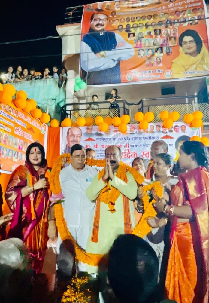 कोटा बिलासपुर में छत्तीसगढ़ प्रदेश भाजपा के नव निर्वाचित प्रदेशअध्यक्ष माननीय अरुण साव जी का कोटा नगर प्रथम आगमन पर भव्य स्वागत किया गया ,सुषमा सिंह के नेतृत्व में भाजपा महिला मोर्चा कोटा के द्वारा महाशक्ति चौक पर भारी संख्या में महिलाओं की उपस्थिति रही , प्रदेश अध्यक्ष के आगमन पर महाशक्ति चौक पर ढोल नगाड़ों से उनका स्वागत करते हुए भाजपा नेत्री सुषमा सिंह व महिला मोर्चा की महिलाओं द्वारा पुष्पगुच्छ देकर तिलक, चंदन लगाकर उन्हें ससम्मान मंच पर लाया गया,